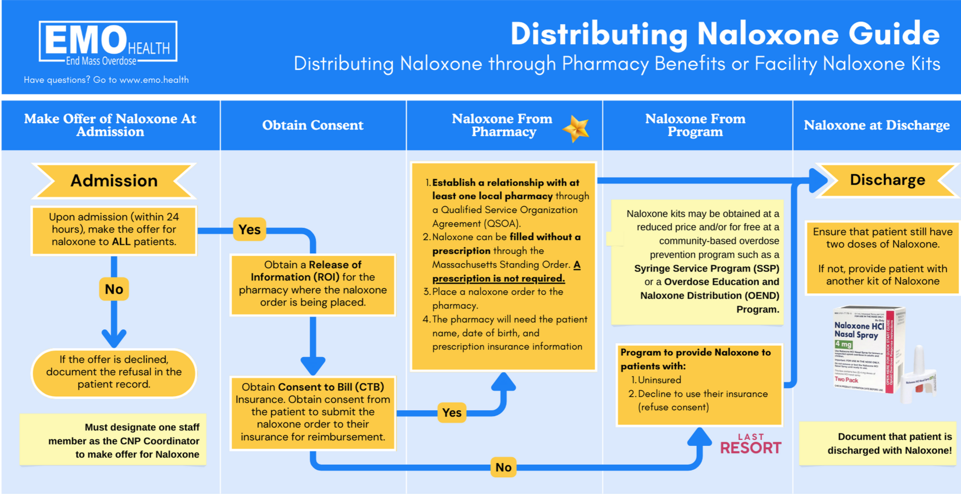 Pursuant to Chapter 285 of the Acts of 2024, Substance Use Disorder (SUD) Treatment Facilities will be required to educate certain patients and residents on the use of naloxone and dispense not less than two doses of naloxone upon discharge effective July 1, 2025. In preparation for this new statutory requirement, this guidance has been created to assist SUD Programs in familiarizing themselves with obtaining naloxone for patient dispensing at discharge.